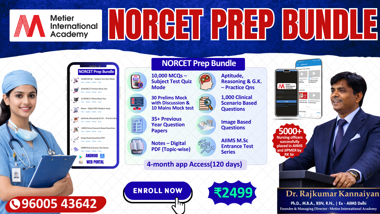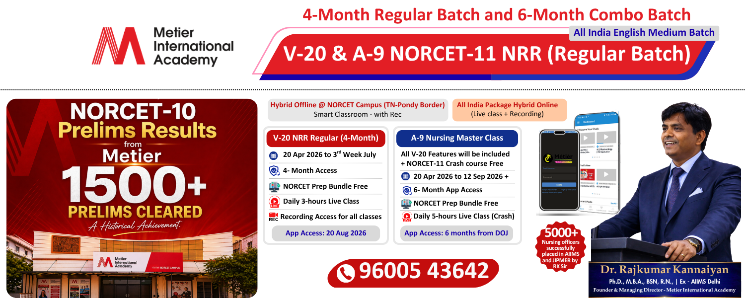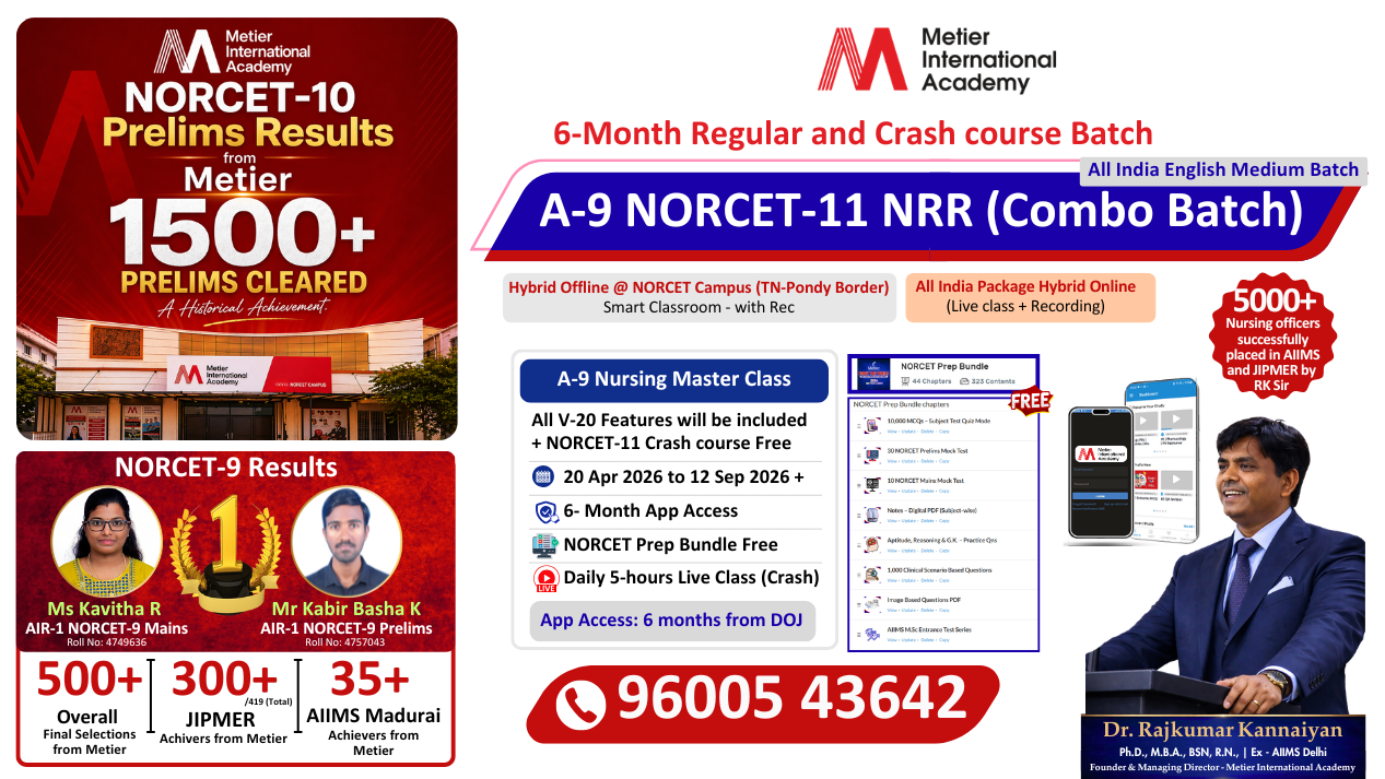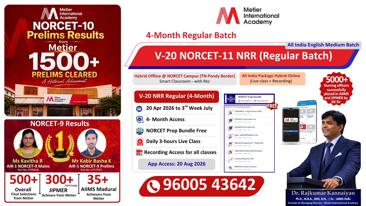 📢 ADMISSION OPEN – NORCET-11 FRESHERS MASTER BATCH 🎓 Exclusive for 2026 Nursing Graduates Metier International Academy proudly launches the A-8 Nursing Master Class – 6 Month Combo Pack for AIIMS NORCET-11 Preparation ━━━━━━━━━━━━━━━━━━━━━━━ COURSE STRUCTURE NORCET Regular Batch March – June 2026 (4 Months) Daily 3 Hours Live Classes 300+ Hours Complete Syllabus Coverage Recording Access Available Concept + MCQ Based Learning NORCET Crash Course July – September 2026 (45 Days) Daily 5 Hours Intensive Revision Daily MCQ Discussion LMR & Rapid Revision Previous Year Questions Discussion ━━━━━━━━━━━━━━━━━━━━━━━ WHY JOIN THIS COURSE? Complete Syllabus Coverage Daily MCQ Practice Strong Concept Building Exam-Oriented Preparation Expert Faculty Guidance 5000+ Successful Selections ━━━━━━━━━━━━━━━━━━━━━━━ COURSE FEE Online Batch – ₹18,880 Offline Batch – ₹20,000 ━━━━━━━━━━━━━━━━━━━━━━━ CLASS VENUE NORCET Hybrid Campus Near IG Statue, Puducherry New Campus (from April) Moratandi, TN–Puducherry Border ━━━━━━━━━━━━━━━━━━━━━━━ Admission Enquiry: 96005 43642 Limited Seats – Admission Open Now Start Your AIIMS Nursing Officer Journey with the Right Guidance